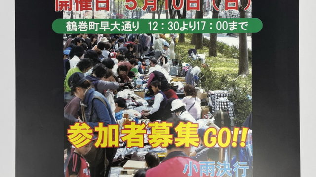 イベント 第35回鶴巻町フェスティバルのお知らせ 5/10(日)早大通り歩行者天国で、第35回鶴巻町フェスティバルを開催します。鶴巻町4町会と早大通り商栄会が共催する春のイベント。MOTTAINAI広場(フリマ)、フードイベント、ダンスイベントが行われます。4/9まで出店者を募集しています。中止の場合、5/17に延期されます。 2026.03.25 イベント